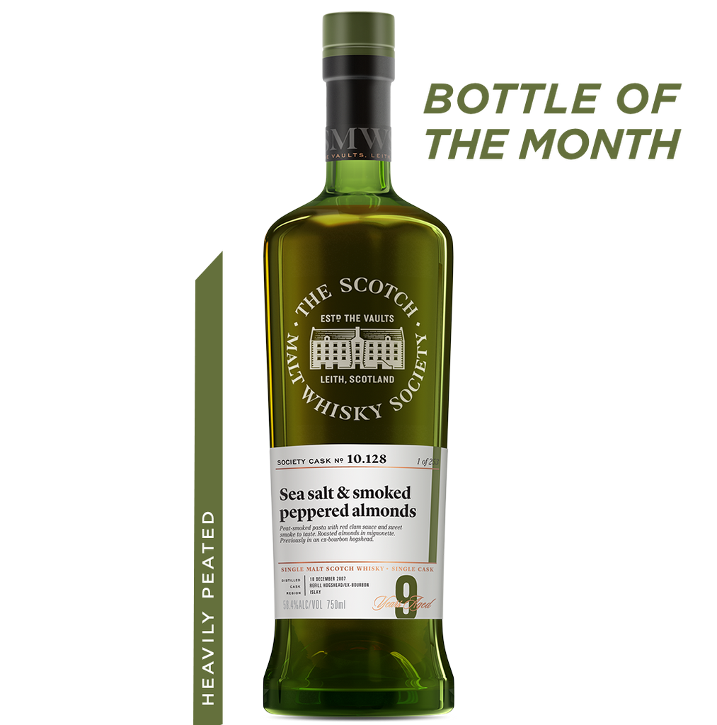 A salty mineralic aroma of rocks covered in algae and seaweed on a sandy beach at first before the sweet peat scent of cooked spaghetti alle vongole con pomodoro appeared. For us non-Italian speakers that is pasta with red clam sauce, olive oil, garlic and tomatoes. Big, sweet, salty, oily and smoky on the palate neat; roasted razor clams, green olives, Manzanilla Sherry and a puff on a cigarillo. With water we walked on a heathery clifftop, the salty sea air blowing in our faces and we were munching salt and vinegar crisps as well as roasted almonds coated in peat-smoked mignonette black pepper and sea salt. After 9 years in an ex-bourbon hogshead we transferred this whisky to a 2nd fill toasted oak hogshead.